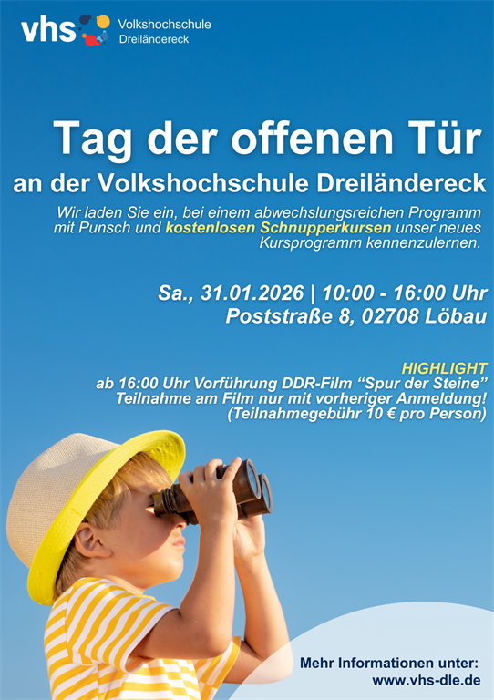 Die Volkshochschule Dreiländereck öffnet am 31. Januar 2026 von 10 – 18:30 Uhr ihre Türen – mit Punsch, Kaffee und Kuchen. Spannende Schnupperangebote laden zum Ausprobieren ein. Und wenn es Ihnen gefällt, können Sie sich gleich anmelden für Ihren favorisierten Kurs.
